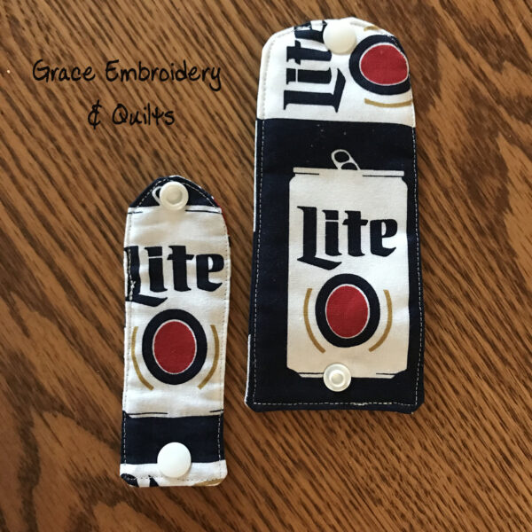 Set of 2 wraps for your power cords: large one is 2.5″ x 5.75″, small one is 4.5″ x 1.5″. Fabric shown is beer cans with white snaps.